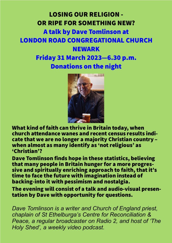 We are delighted that Dave Tomlinson, Christian writer and Church of England priest is coming from London to give a public talk in the church on Friday 31 March 2023 – 6.30 pm.